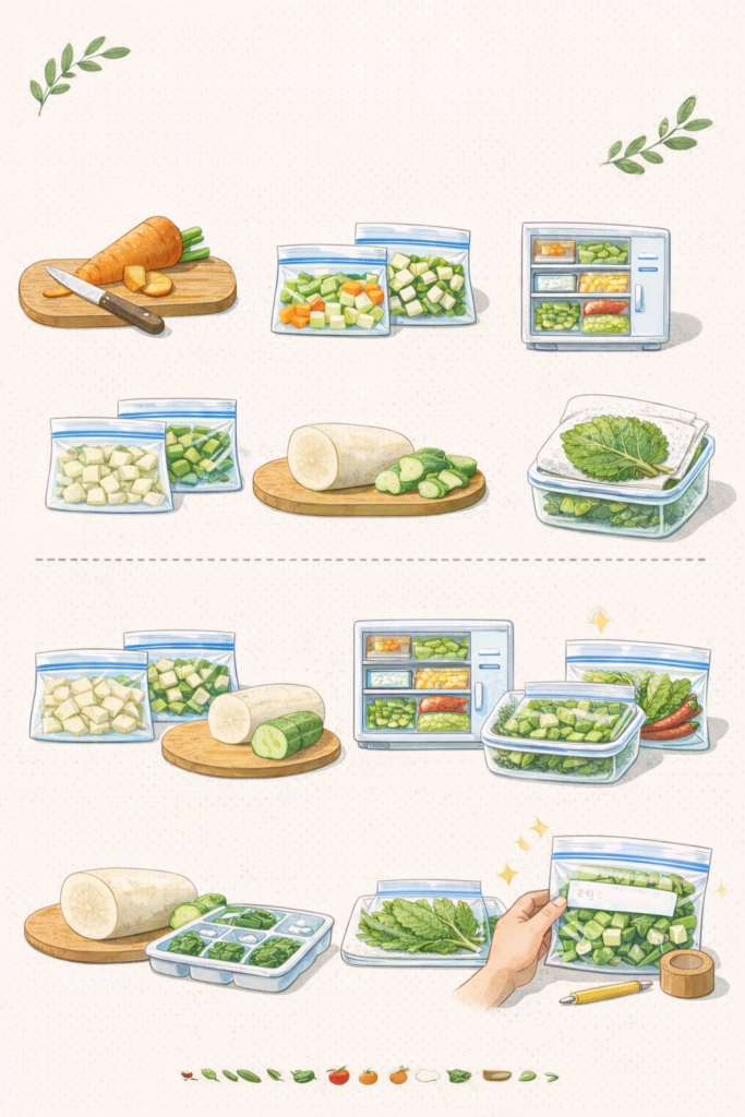 • 당근: 채썰기 / 깍둑 → 냉동